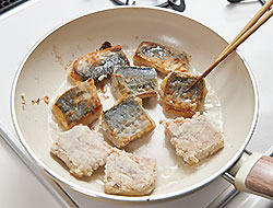 (2)フライパンにサラダ油を熱し、凍ったままのさわらを包材通りに揚げ焼きにする。