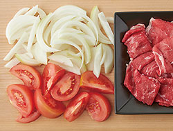 (1)牛肉は幅3~4cmに切り、たまねぎは幅8mmに切る。トマトはくし切りにしておく。