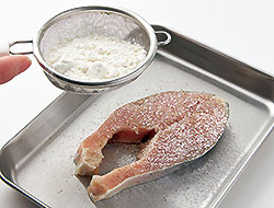 (1)解凍したサーモンは水気をふいてこしょうで下味をつけ、小麦粉をまぶす。