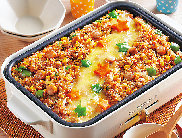 (1)ウインナーは輪切り、トマトはすりおろす。玉ねぎと人参はみじん切り、ピーマンは1cm角に切り、カレールウは細かく砕く。米は洗ってザルに上げる。(2)ホットプレートにAを入れて230℃に熱し、香りが出たらウインナー、玉ねぎ、人参を炒める。しんなりしたら米、カレールウを加えて炒め合わせ、残りの(1)、粒コーン、Bを加えてひと混ぜする。(3)煮立ったら蓋をし、150℃に下げて約15分煮る。保温にし、中心をくぼませてチーズ、星型で抜いてゆでた人参とピーマンをのせ、蓋をしてチーズが溶けるまで蒸らす。※材料はコープきんきで取り扱いの商品を使っています