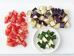 (1)ズッキーニ、なす、トマトは2cm角に切る。フライパンにサラダ油を熱し、ズッキーニ、なす、おやコーンを入れしんなりするまで炒めたら、トマト、顆粒コンソメを入れさっと炒める。