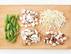 (1)きのこ類は石づきを落とし、しいたけとエリンギは1cmの角切りにする。えのきとしめじはざく切りにする。スナップえんどうは筋をとって斜め3等分に切る。
