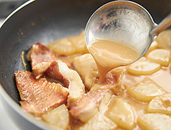 煮汁にとろみがつきだしたらいい頃合い。具材に煮汁をかけながら煮詰めることで、味染みがよくなります。