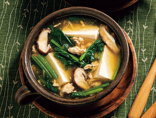 (1)豆腐は食べやすく切る。生しいたけは薄切り、ほうれん草はざく切りにする。(2)鍋にAを熱し、香りが出たらミンチを入れてほぐしながら炒める。肉の色が変わったら、生しいたけ、Bを加えて煮立てる。(3)ほうれん草を加えてサッと煮、水溶き片栗粉でとろみをつけ、豆腐を入れて温める。※材料はコープきんきで取り扱いの商品を使っています