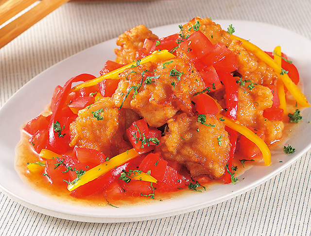 (1)鶏肉はAで下味をつけ、片栗粉をまぶす。トマトは角切り、ピーマンは細切りにする。(2)ボウルにBを混ぜ合わせ、トマト、ピーマンを加えて漬ける。(3)フライパンに多めの油を熱し、鶏肉を揚げ焼きにする。熱いうちに(2)に加えて混ぜ、冷ます。(4)器に盛り、パセリを散らす。※材料はコープきんきで取り扱いの商品を使っています