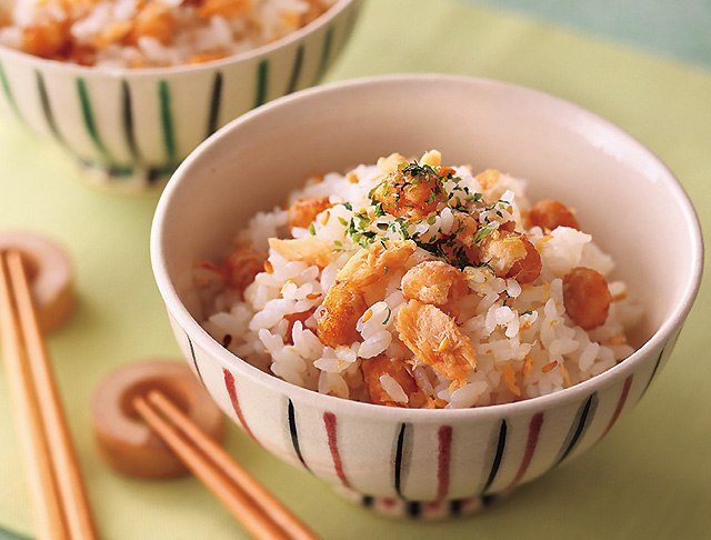 (1)大豆に片栗粉をまぶす。(2)フライパンに油を熱し、(1)を入れて揚げ焼きにする。余分な油を拭き取り、Aを加えてからめる。(3)ボウルにご飯、(2)、鮭フレーク、ごまを入れて混ぜる。(4)碗に盛り、青のりをふる。※材料はコープきんきで取り扱いの商品を使っています