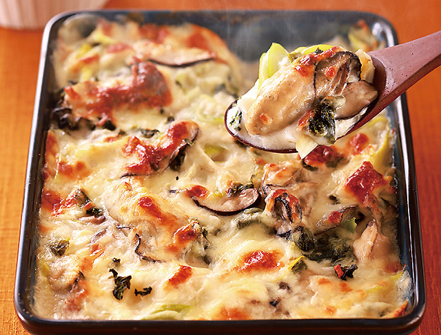 (1)かきは水気を拭いてこしょうをふる。白ねぎは斜め切り、しいたけは薄切りにする。(2)フライパンにバターを溶かし、(1)を炒める。小麦粉をふり入れて粉っぽさがなくなるまで炒め、Aを加えてとろみがつくまで混ぜながら煮る。あおさを加えて全体を混ぜる。(3)耐熱の器に(2)を入れ、チーズを散らしてトースターで焼き色がつくまで焼く。※材料はコープきんきで取り扱いの商品を使っています