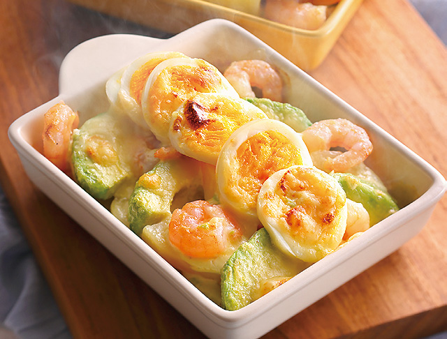 (1)アボカドは薄切り、じゃがいもは半月切りにする。(2)耐熱ボウルにむきえび、じゃがいもを入れ、ふんわりとラップをかけてレンジ(600W)で約5分加熱する。(3)ボウルにAを混ぜ合わせ、アボカド、(2)を加えて和える。耐熱の器に入れ、ゆで卵をのせてチーズを散らし、トースターで焼き色がつくまで焼く。※材料はコープきんきで取り扱いの商品を使っています