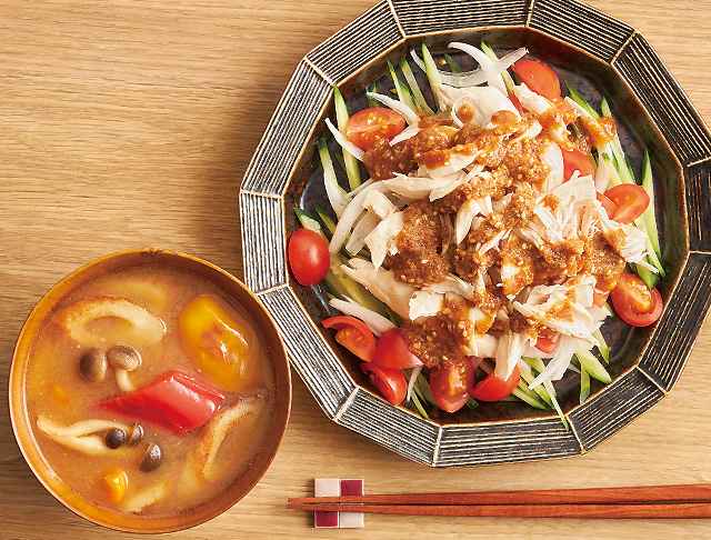 しっとりささみのバンバンジー、焼き野菜みそ汁
