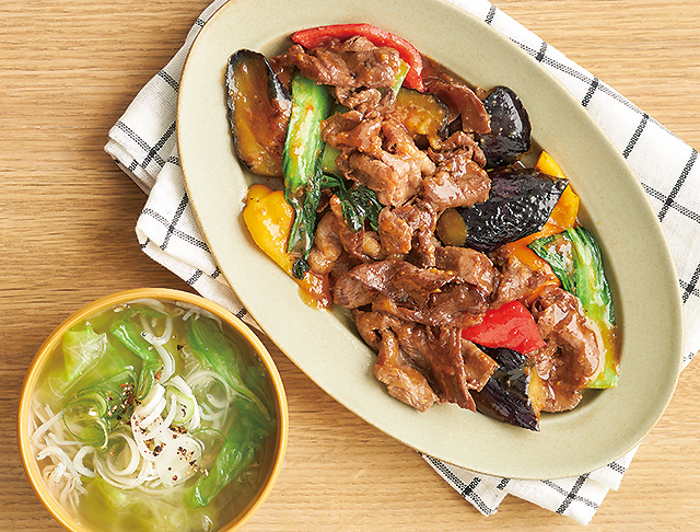 牛肉とたっぷり野菜のみそ炒め、しらすとレタスのスープ