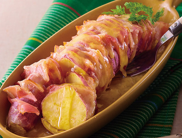 (1)さつまいもは切り落とさないように5mm幅で切り込みを入れる。ベーコンは2cm幅の短冊切りにする。(2)耐熱皿にさつまいもをのせ、ふんわりとラップをかけてレンジ(600W)で約5分加熱する。切り込みにベーコンをはさみ、ちぎったバターを全体に散らしてピザ用チーズを散らす。(3)トースターで約10分焼き、はちみつをかけていただく。※材料はコープきんきで取り扱いの商品を使っています