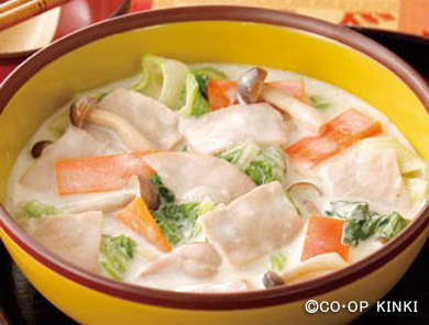(1)ロースハムは食べやすく切る。白菜は軸の部分を短冊切り、葉の部分をざく切りにする。にんじんは短冊切り、しめじは小房に分ける。(2)鍋にAを煮立て、(1)を入れる。白菜がしんなりしてきたら牛乳を加え、Bで調味し、水溶き片栗粉適宜でとろみをつける。※材料はコープきんきで取り扱いの商品を使っています