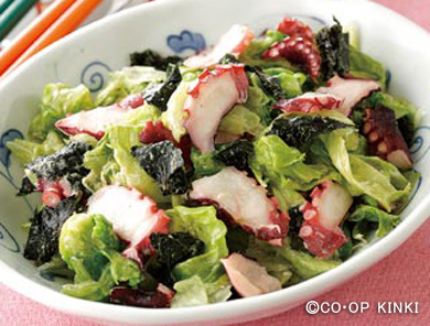 (1)梅酢たこは解凍し、薄切りにする。レタスはひとくち大にちぎり、サッと熱湯をまわしかけ、冷水にとってザルに上げる。焼きのりはひとくち大にちぎる。(2)ボウルにAを合わせ、(1)を加えて混ぜ合わせる。※材料はコープきんきで取り扱いの商品を使っています
