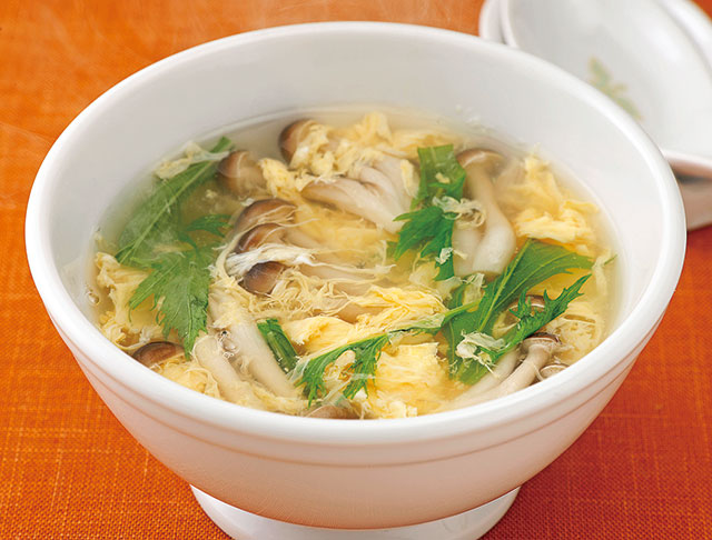 (1)しめじは小房に分け、水菜はざく切りにする。(2)鍋に水、「化学調味料無添加の貝柱スープ」を煮立て、しめじ、水菜を加えてひと煮し、しょうゆ、溶き卵を回し入れてひと煮する。※材料はコープきんきで取り扱いの商品を使っています