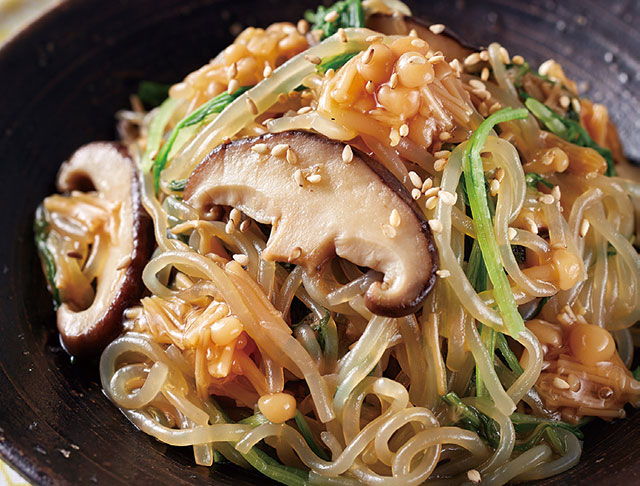 (1)糸こんにゃくはゆでてザルにあげ、水気をきって食べやすく切る。生しいたけは薄切り、水菜は4㎝長さに切る。(2)フライパンに油を熱し、糸こんにゃく、生しいたけを入れて炒める。なめ茸、Aを加えて汁気がなくなるまで炒め、水菜を加えて混ぜ合わせる。器に盛ってごまをふる。※材料はコープきんきで取り扱いの商品を使っています