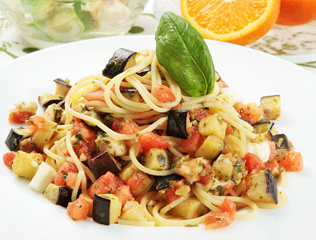 (1)モッツァレラチーズは1cm角に切る。(2)なすは1.5cm角に切り、多めのオリーブ油で揚げるように火を通し、油をきっておく。(3)スパゲッティは熱湯2リットルに塩大さじ1+1/3(分量外)を加えて袋の表示通りにゆで、ザルにあげて湯をよく切る。イタリアンハーブトマトソースを鍋に入れて温め、(1)と(2)、(3)を加えて和え、塩と胡椒で味を調え、バジルを添える。