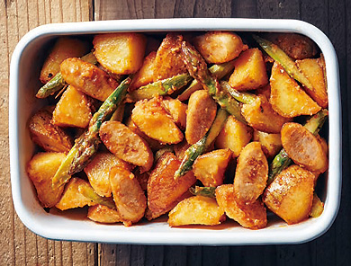 (1)ウインナーは斜め切りにし、アスパラは斜め切りにしてゆでる。じゃがいもは皮つきのまま小さめの乱切りにし、水にくぐらせて耐熱容器に入れ、ラップをかけてレンジ(600W)で約5分加熱する。(2)フライパンにオリーブ油を熱し、じゃがいも、ウインナー、アスパラの順に入れて炒める。Aを加えて炒め合わせる。※エネルギー・塩分は全量の値です