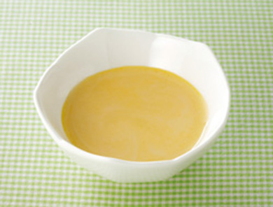 《かたさの目安》 かぼちゃのかたさは、とろとろのポタージュ状が目安です。ゆでて裏ごしするか、なめらかにすりつぶしましょう。