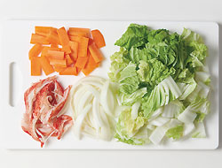 (1)皿うどんの添付スープ2袋は、包材通りの水の分量で溶かしておく。(2)白菜はざく切り、たまねぎはくし切り、人参は短冊切り、サラダフレークは大きめにほぐしておく。