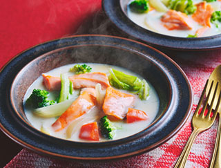 材料:生鮭切身、白菜、玉ねぎ、人参、ブロッコリー、バター、牛乳、片栗粉、コンソメ顆粒、塩・胡椒