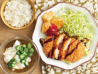 材料:衣サクサクやわらかとんかつ、じゃがいもの唐揚げ、キャベツ、サラダ油、中濃ソース、ケチャップ、沖縄県産味付糸もずく、長いも、オクラ、塩