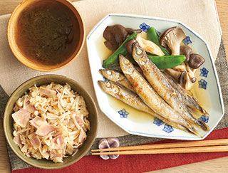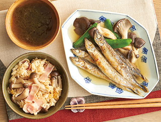 おまかせ献立(3人分)ししゃもと野菜の焼きびたし、ベーコンとえのきの炊き込みご飯、もずくスープ