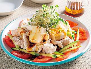 材料:ほたて貝柱水煮(ほぐし身)缶、トマト、オクラ、木綿豆腐、温かいご飯、とろろ昆布