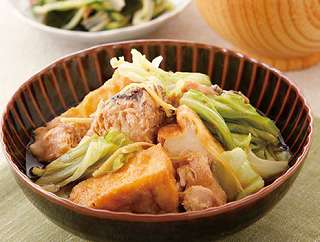 材料:さけ(水煮缶)、絹厚あげ、キャベツ、生姜(せん切)