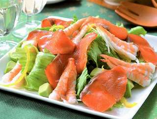 材料:紅鮭スモークサーモン、サラダえび、アボカド、玉ねぎ、カラーピーマン、レタス、お好みのドレッシング