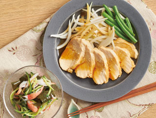 おまかせ献立(3人分)レンジでムネ肉の鶏チャーシュー、カニカマとわかめの酢の物