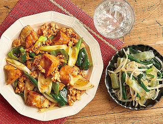 材料:絹厚揚げ、元気鶏若鶏ミンチ、麻婆茄子のたれ、白ねぎ、ピーマン、ごま油、さしみこんにゃく、緑豆もやし、にら、a)水、塩、b)さしみこんにゃく添付のたれ、中華スープの素・ごま油、しょうゆ