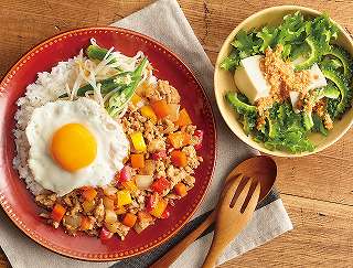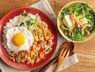 おまかせ献立(2人分)手軽にアジアンガパオ風ライス、豆腐でふんわりゴーヤのピーナツサラダ