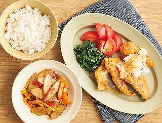 材料:ほっけのカリッと揚げ、ほうれん草、トマト、大根、サラダ油・ポン酢