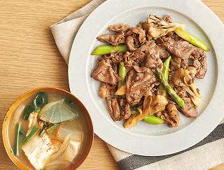 おまかせ献立(2人分)牛肉とアスパラガスのこく旨炒め、炒め豆腐のかみなり汁