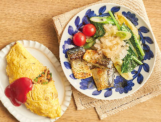 おまかせ献立(2人分)青のり香る焼きさばみぞれがけ、とりそぼろミニオムレツ