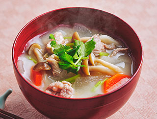 材料:豚こま切、大根、人参、しめじ、三つ葉、白みそ、だし汁