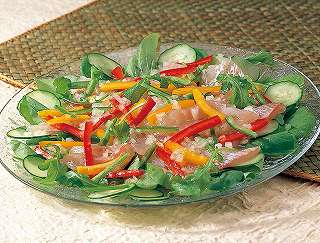 材料:鯛刺身用、玉ねぎ、ピーマン、赤・黄ピーマン、ルッコラ、きゅうり