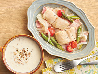 材料:豚こまぎれ、春キャベツ、じゃがいも、玉ねぎ、グリーンアスパラガス、牛乳、みそ、オリーブ油、顆粒コンソメ、塩・こしょう