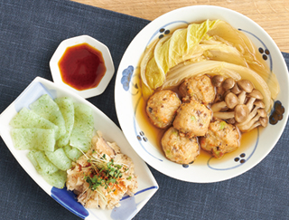 材料:野菜の鶏つみれ、手揚げ風油あげ、白菜、白ねぎ、水、サラダ油、こしょう