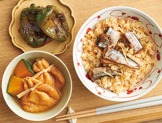 さんまと生姜の炊き込みごはん、もち巾着と南瓜の煮付け、丸ごとピーマン焼き