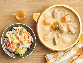 南瓜とチキンのクリームシチュー、アボカドとサラダフレークのジンジャーサラダ