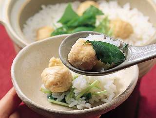 材料:チキンボール、米、ごま油、みつ葉、塩、土生姜