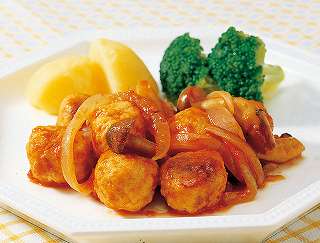 材料:チキンボール、サラダ油、玉ねぎ、しめじ、サラダ油、ホールトマト、コンソメスープの素、胡椒、じゃがいも、ブロッコリー