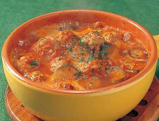 材料:とり団子、なすび、ホールトマト、ブイヨン、水、ローリエ、砂糖、塩、パセリ