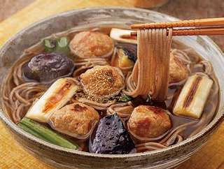 材料:鶏肉だんご、十割そば、白ねぎ、冷凍カット揚げなす、油、めんつゆ(ストレート)、粉山椒