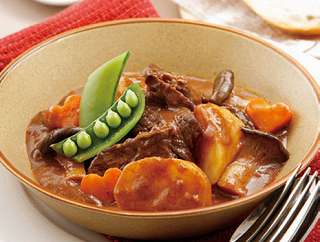 材料:牛やわらかハラミカット、エリンギ、人参、じゃがいも、スナップエンドウ、玉ねぎ、オリーブ油、赤ワイン、小麦粉・塩・胡椒