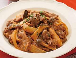 材料:牛切落し、エリンギ、しめじ、玉ねぎ、小麦粉、バター、塩・胡椒、パセリ(粗みじん切)