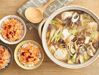 材料:真だら切身、白菜キムチ、大根、白ねぎ、にら、生しいたけ、木綿豆腐