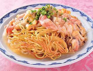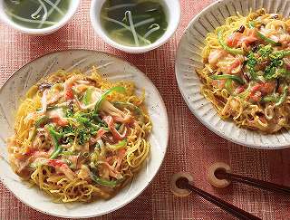 材料:中華麺、しょうゆ、油、たこ入シーフードミックス、ミニトマト、カレー粉、水溶き片栗粉、カニかま(ほぐす)、にら(小口切)、水溶き片栗粉、たこ入シーフードミックス、白ねぎ(斜め切)、水溶き片栗粉、溶き卵