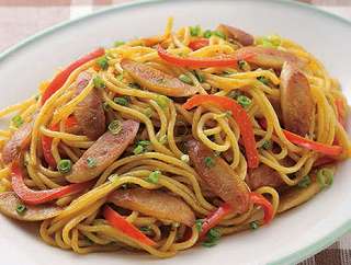材料:ポールウインナー、焼そば麺、赤ピーマン、青ねぎ(小口切)